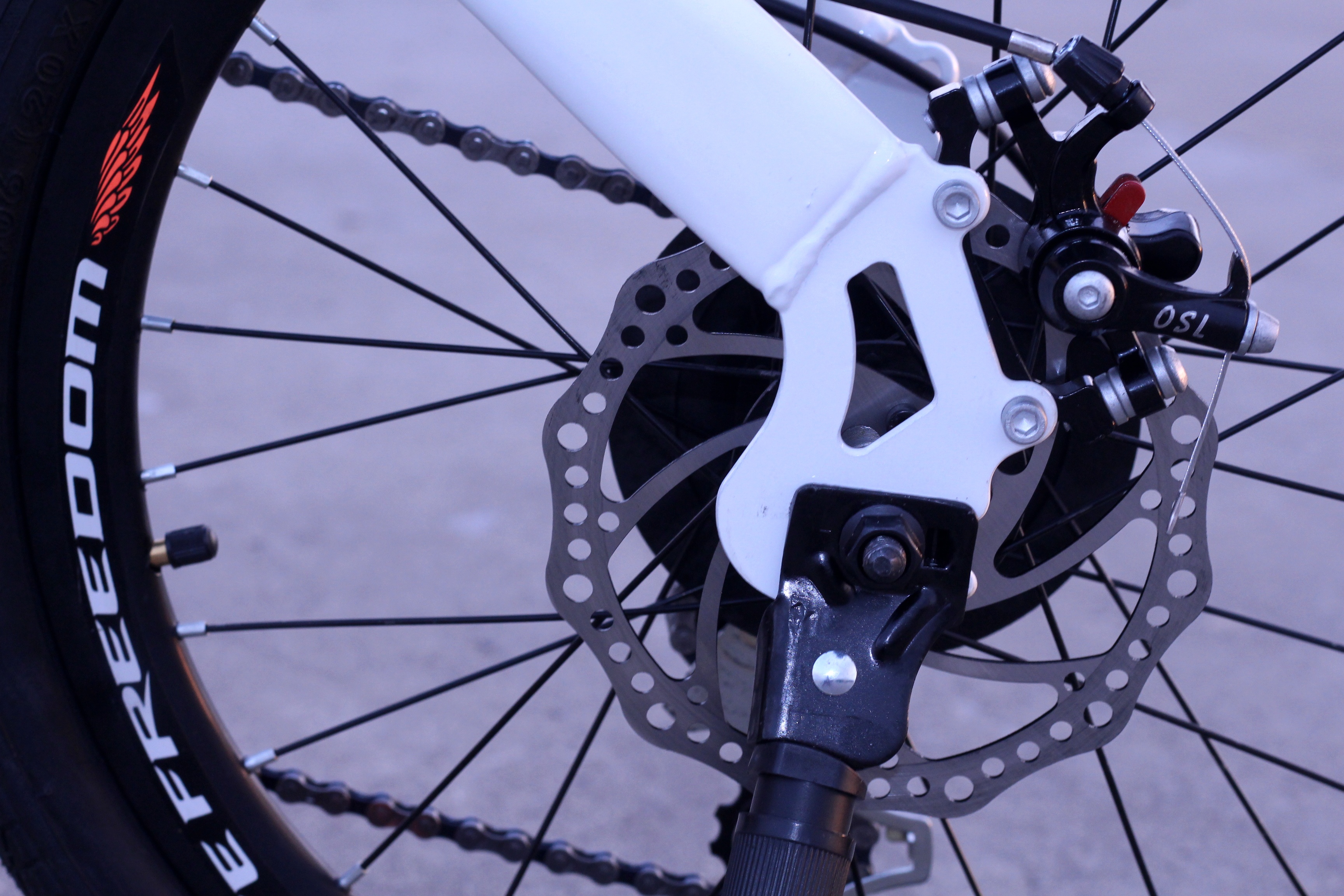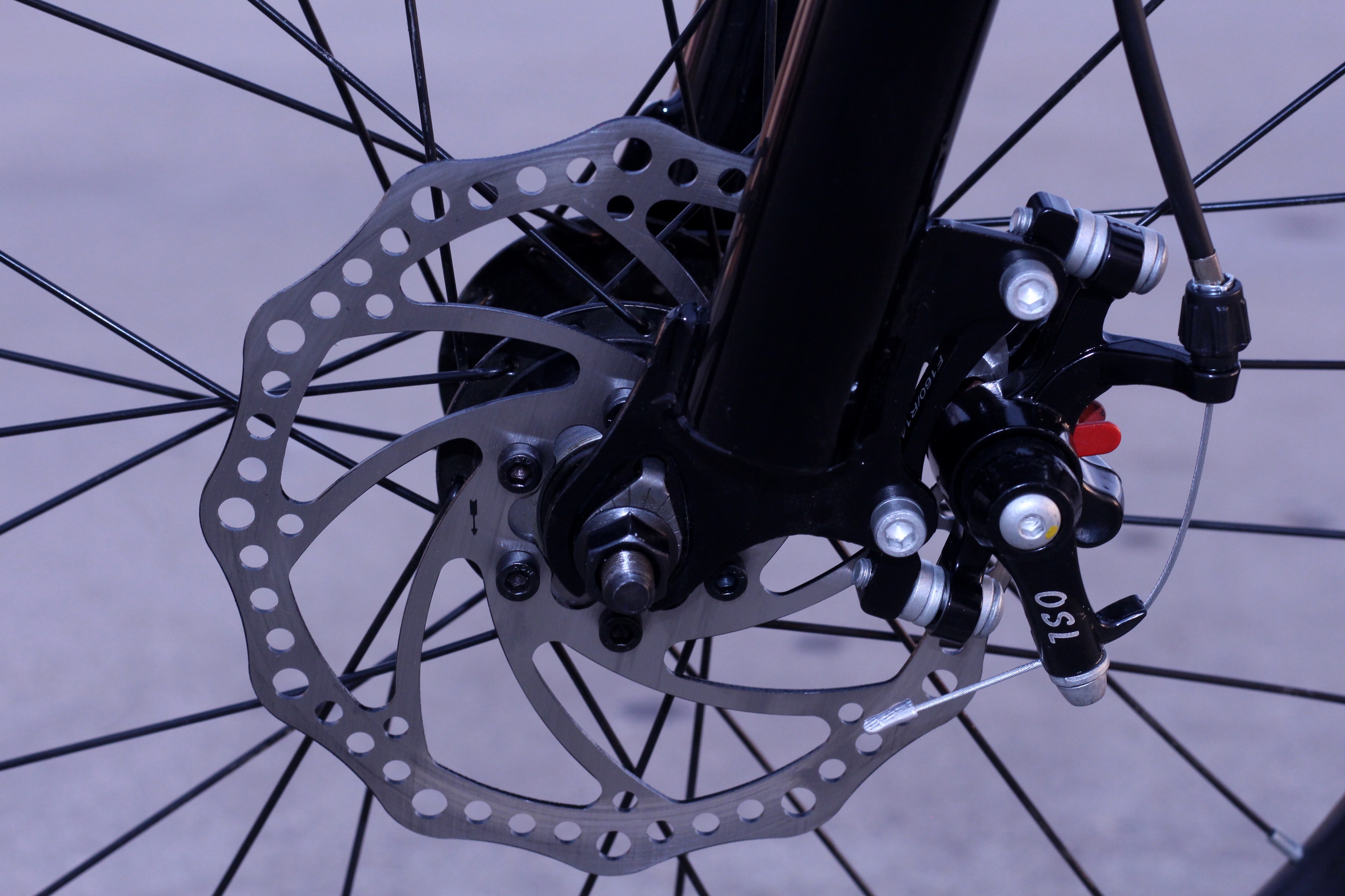Fortes e confiáveis, os freios a disco nas duas rodas promovem tranquilidade nas descidas e pedaladas na cidade, onde o trânsito demanda atenção e respostas rápidas.